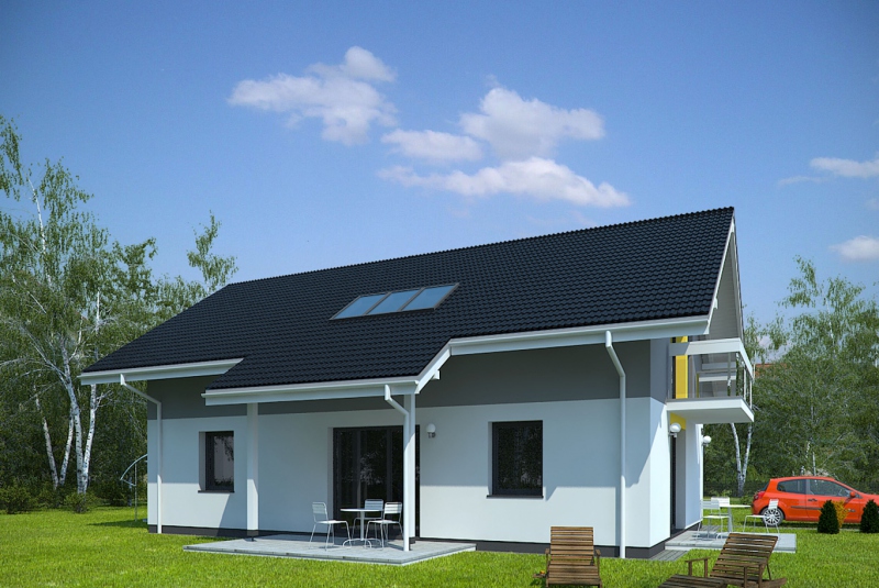 Prízemný rodinný dom 34 s podkrovím, sedlovou strechou a pristavanou garážou je vhodný na rovinatý alebo mierne svahovitý terén. Ideálna orientácia hlavného vstupu je na sever.